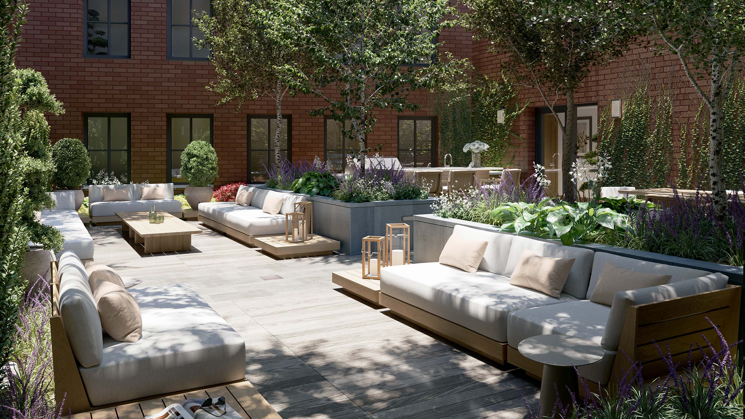 Furnished by RH Gallery, the well-appointed lounge features custom millwork, large-screen TV and kitchenette, opening out to a landscaped courtyard.